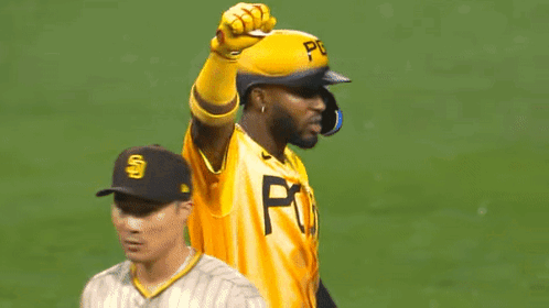 Rodolfo Castro, a Pittsburgh Pirates baseball player, raises his hand and claps on the field in his yellow uniform.