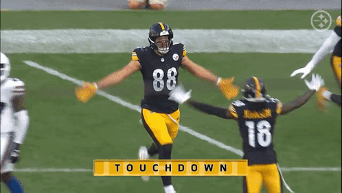 Pittsburgh Steelers' Pat Freiermuth celebrates a touchdown with Diontae Johnson on the field.