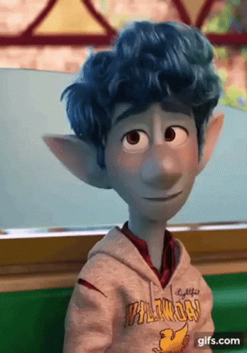 Ian Lightfoot, the blue-haired elf from Pixar's Onward, smiles and blinks, wearing his signature hoodie.