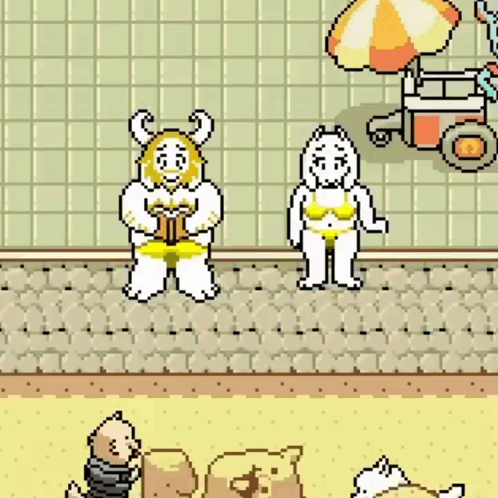 a couple of cartoon characters standing next to each other on a beach in a pixel art video game .