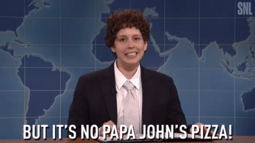 Comedian in a suit and tie delivers a line about Papa John's Pizza on Saturday Night Live.