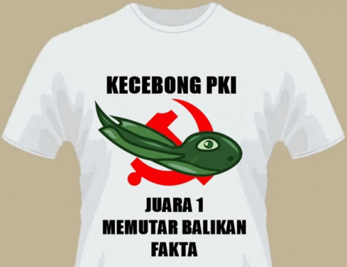 White T-shirt with a green tadpole and the text 'KECEBONG PKI JUARA 1 MEMUTAR BALIKAN FAKTA'.