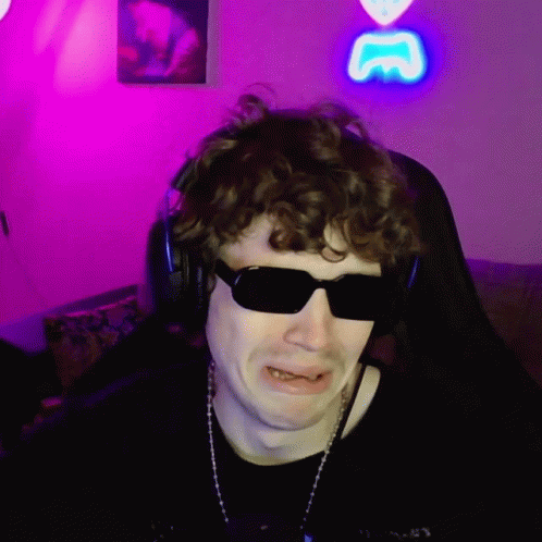 A man with curly hair, sunglasses, and headphones makes a distressed, crying face.