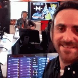Camille Combal, host of Plan C, smiling and gesturing while wearing headphones in a studio setting.
