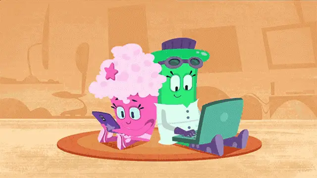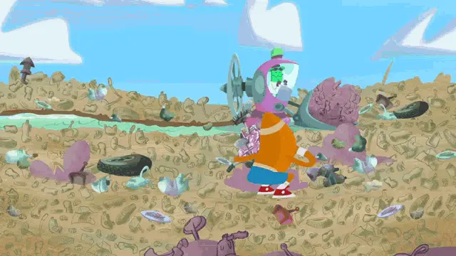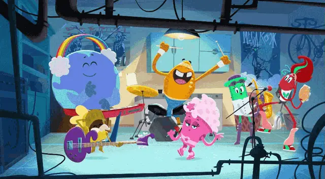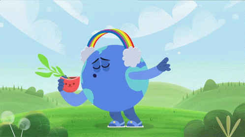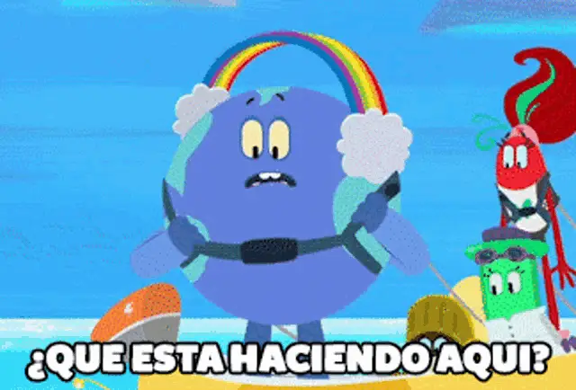 Cartoon character Planeta Tito, a blue Earth-like figure with a rainbow headband, happily holds a slice of watermelon.