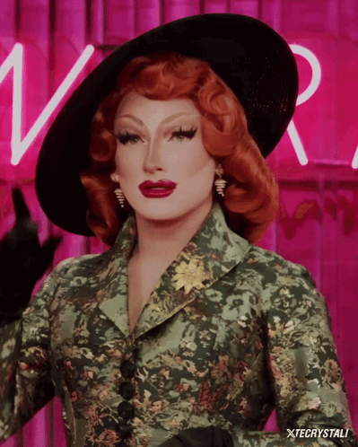 Plasma from RuPaul's Drag Race Season 16 in a green patterned outfit, black hat, and red wig.