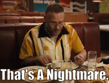 Seth Rogen, as Will in Platonic, sits at a diner table with food, reacting with the caption "That's A Nightmare."