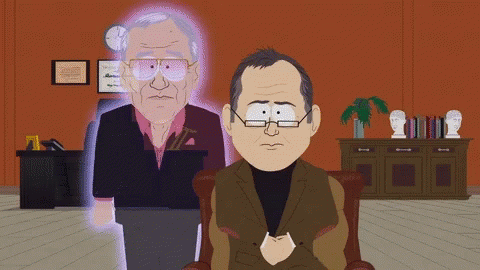 A South Park character asks about seeing dead celebrities, with Hugh Hefner's ghost present.
