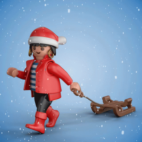 Playmobil figure in Santa hat pulls a sleigh through falling snow in a festive winter scene.