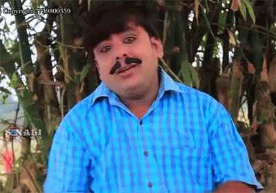 A man with a fake mustache, wearing a blue checkered shirt, begs with folded hands in front of bamboo.
