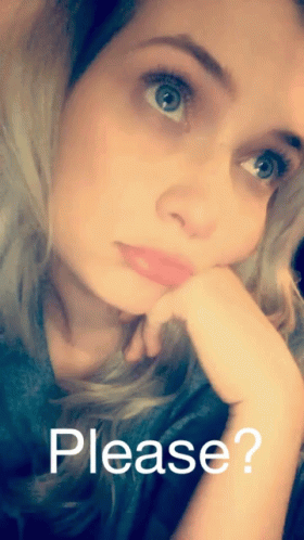 A young woman with a pleading expression, pouting with the word 'Please?' displayed on screen.