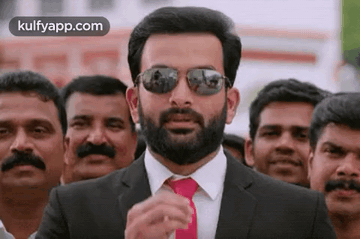 Prithviraj Sukumaran, wearing sunglasses and a suit, makes a requesting gesture in a scene from Brothers Day.