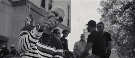 Plk, wearing sunglasses and a striped shirt, gestures while rapping in a black and white scene with a crowd.