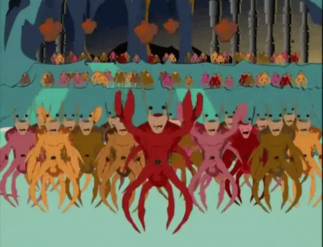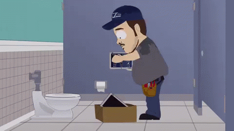 A South Park plumber character in a bathroom, handling tablets and placing them into a cardboard box.