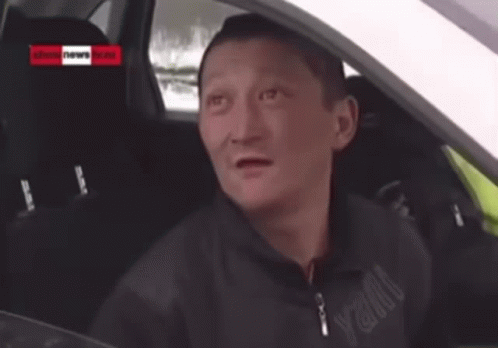 A man sitting in a car makes a funny, expressive face, showing a humorous reaction.