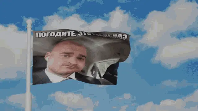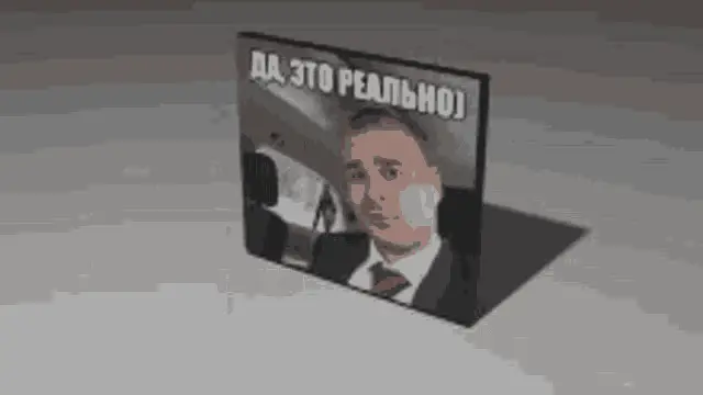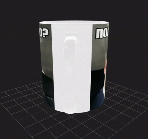 Rotating mug featuring Tesak with the Russian text 'Погодите, Это Реально' (Wait, This Is Real) and earbuds.