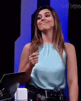 Vivian Amorim nodding and saying 'Pois é' (That's right) on Gshow, wearing a light blue top.
