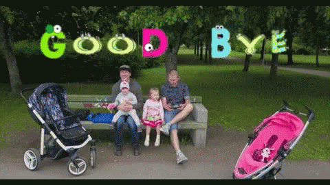 Family with two children waving goodbye from a park bench, with 'GOODBYE' text overlay and strollers nearby.