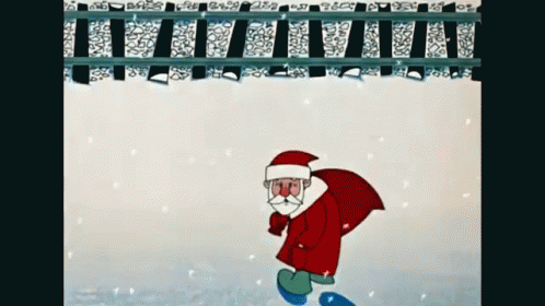 A cartoon Santa Claus walks away through a snowy landscape, leaving blue footprints behind him.