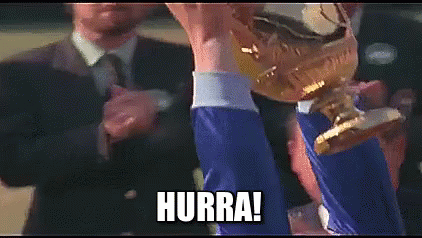 Boris Becker celebrates his Wimbledon victory, holding the golden trophy high with a triumphant 'Hurra!'