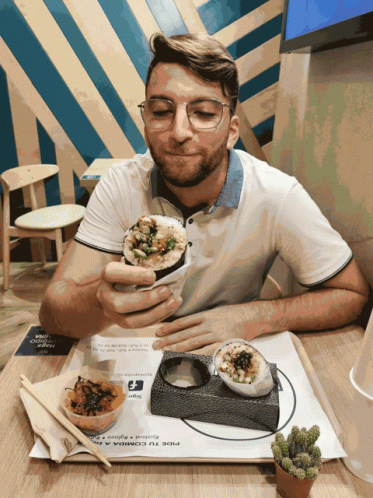 A man with glasses happily enjoys a fresh poke bowl at a restaurant, with a "Pide tu comida" sign visible.