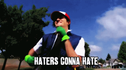 Ash Ketchum in his Pokemon costume, confidently posing with the text 'Haters Gonna Hate'.