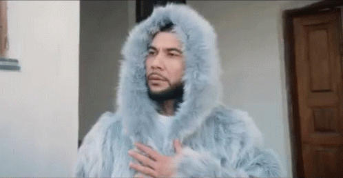 Mc Doni (Джин) in a grey fur coat with a hood, looking to the side.