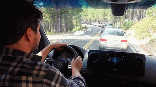 Henrique Fonseca gives a thumbs up while driving a Mercedes van on a road, looking back at the camera.