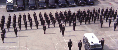 Chang Cheh's police force in formation, marching in a large outdoor area with vehicles lined up behind them.