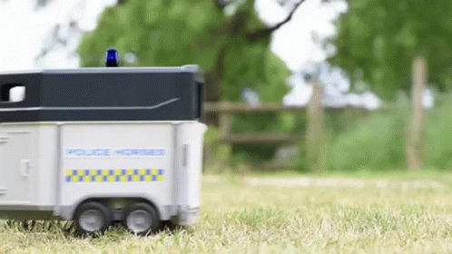 Toy police horse trailer with flashing lights, carrying two toy police horses in high-vis vests.