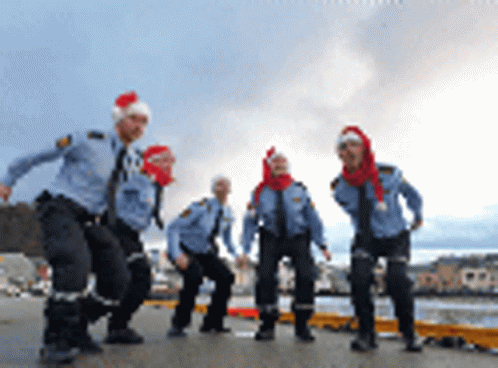 Five police officers in Santa hats and scarves enthusiastically jumping and cheering for Christmas in Ålesund, Norway.