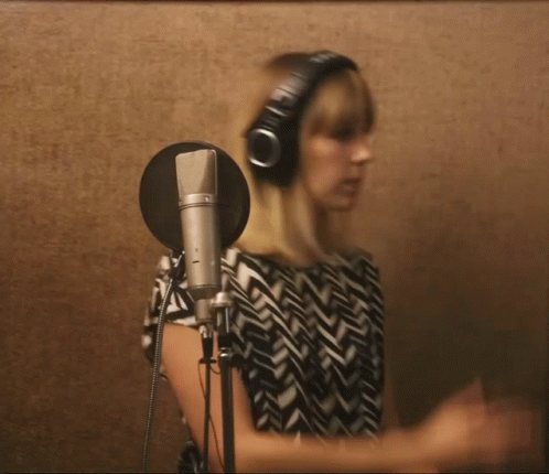 Pomplamoose member performing a robot dance while singing into a microphone with headphones.