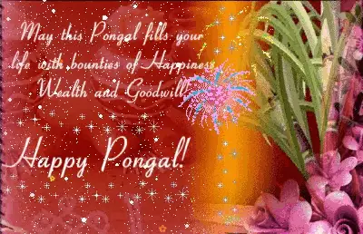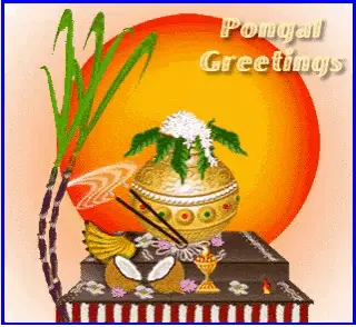 Celebrate Happy Pongal with a vibrant scene featuring a traditional pot, palm trees, sun, and a Kubota tractor.