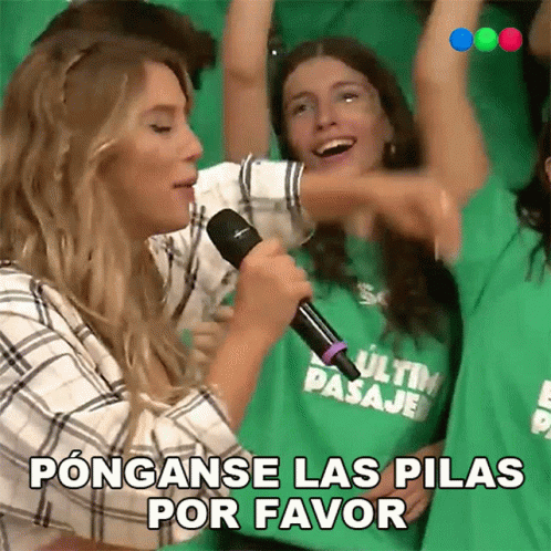 Flor Vigna passionately urges the audience to 'Pónganse Las Pilas Por Favor' while holding a microphone.