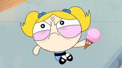 Bubbles from Powerpuff Girls is furious, holding an ice cream cone with a venomous snake tongue.