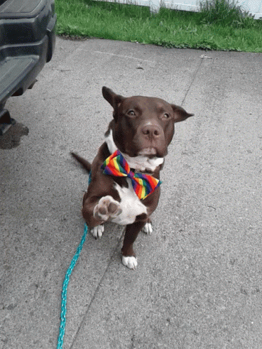 Ponyboy Sd, an adorable brown and white pitbull wearing a rainbow bow tie, sits patiently and waves its paw.