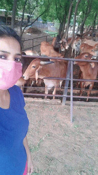Pooja Poojasaini takes a selfie wearing a pink mask, surrounded by a herd of brown cows.