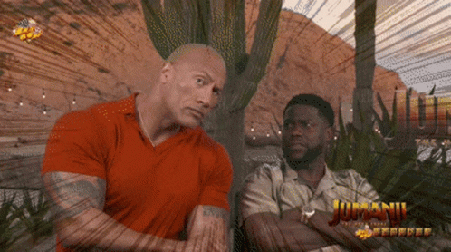 Dwayne Johnson and Kevin Hart in a Jumanji interview, set against a desert backdrop.