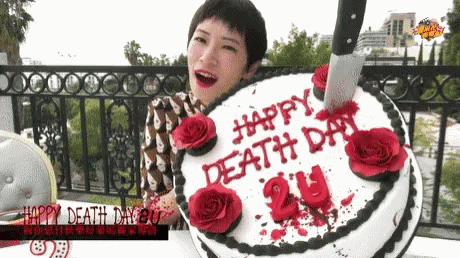 Annie Weng smiles with a 'Happy Death Day 2U' cake, featuring a knife and red roses.