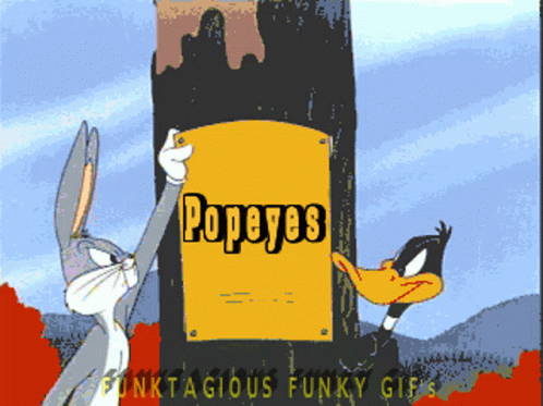 Bugs Bunny and Daffy Duck stand next to a Popeyes sign, referencing the spicy chicken sandwich debate.