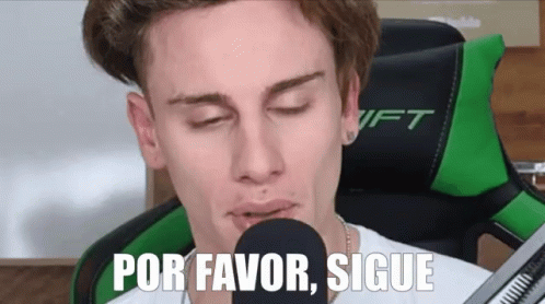 Gian Gg speaking into a microphone, with the phrase 'Por Favor, Sigue' (Please, Continue) overlaid.