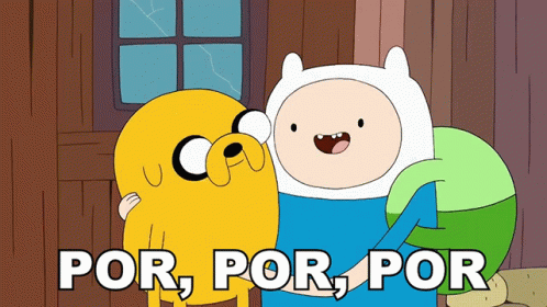 Finn and Jake from Adventure Time hugging, with the Spanish phrase '¿Por qué?' displayed on screen.