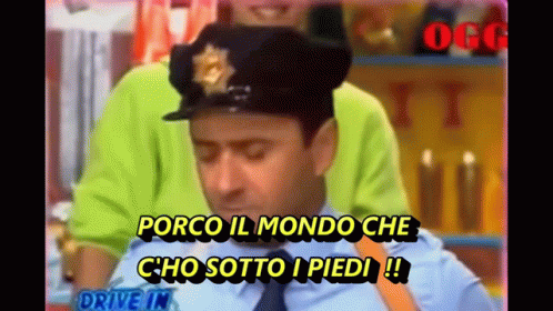 Man in a police hat passionately exclaims 'Porco il mondo che c'ho sotto i piedi!' from an Italian TV show.