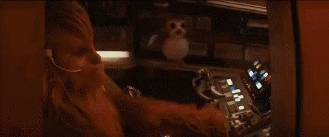 Porg and Chewbacca in the Millennium Falcon cockpit, then Porg looks out a window.