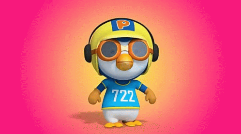 Pororo, the animated penguin, dances to 'Hello Hello' while wearing headphones and a blue shirt.