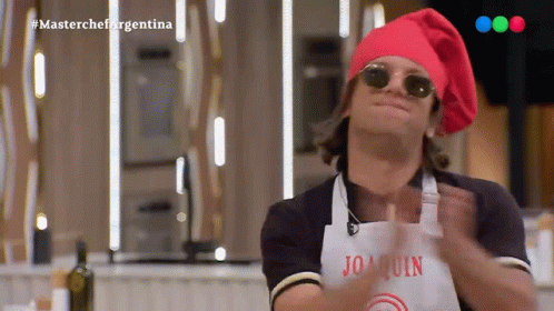 Joaquín Levinton, wearing a red chef hat and sunglasses, strikes an exaggerated pose on the set of Masterchef Argentina.