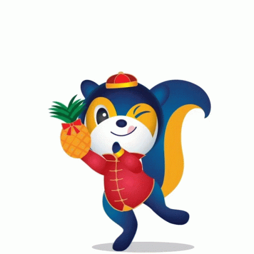 A cheerful cartoon squirrel in a traditional red outfit holds a pineapple, wishing 'More Prosperity For All!' for Chinese New Year.