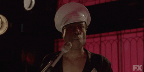 Pray Tell from Pose reacts with an iconic and emphatic 'WHAT?!' while holding a microphone.