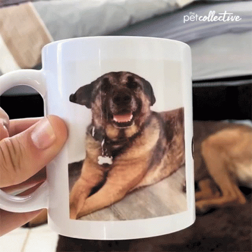 A cute dog's picture on a mug compared to its real-life pose, highlighting the 'Expectation vs. Reality' humor.
