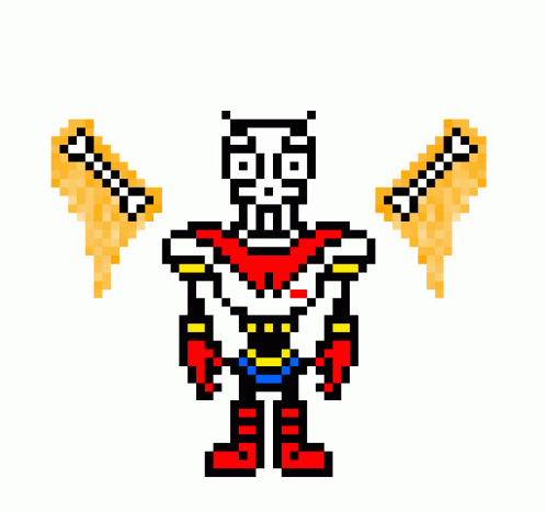 Papyrus from Undertale in pixel art, exclaiming 'NYEH!' with his signature pose.